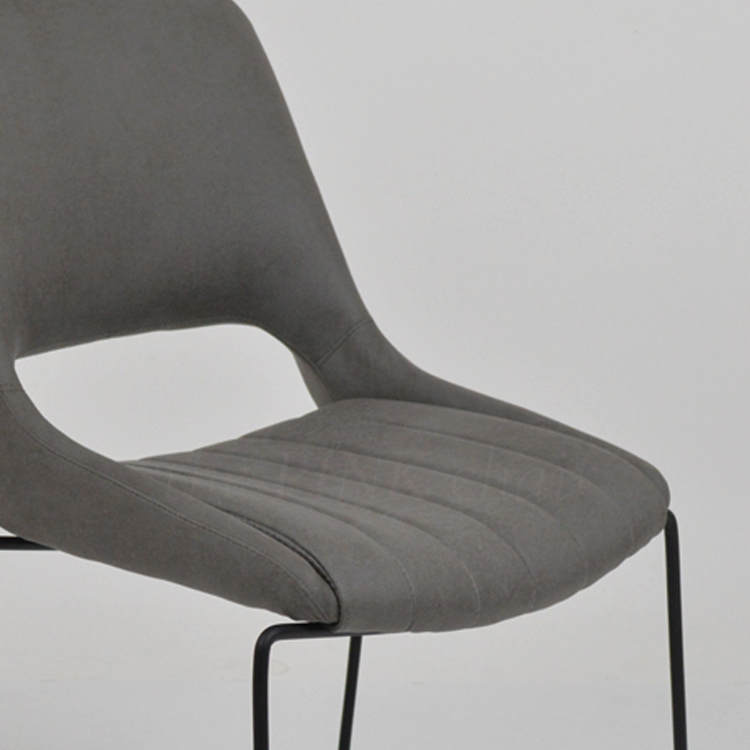 Monocasco de madera multilaminado tapizado en genero Cuerotex color Grey, estructura trineo de hierro pintado en horno con pintura tipo epoxi, color Negro.